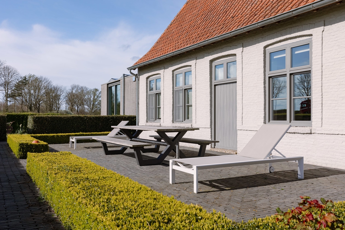 Eigen terras met tuinset, 2 ligzetels en barbecue